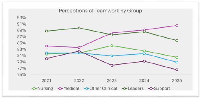 In a five-year review of more than 67K safety culture survey responses received by the Center for Patient Safety, Leaders rated Teamwork more than 5% higher than other employee types (Nursing Staff, Other Clinical Staff, Support Staff). Notably, the Medical Staff, sometimes referred to as influential leadership, reports even greater perception of teamwork within their organization. These discrepancies suggest there is a disconnect between how those in leader roles perceive teamwork and how frontline staff actually perceive it to be.